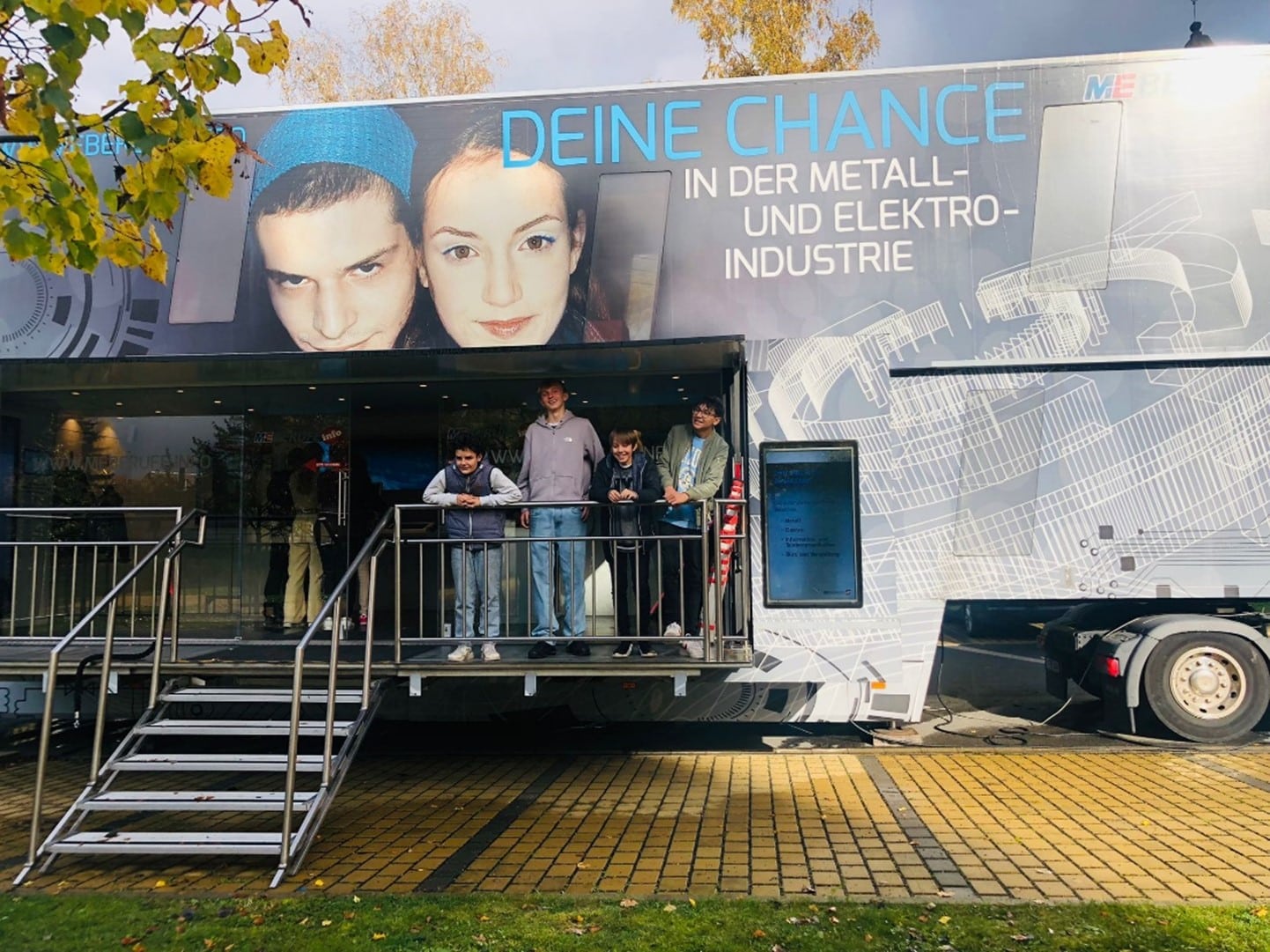 Am 08.11.2023 hat unsere Klasse den ME (Metall- und Elektrotechnik) Berufe Infotruck besucht. Dieser Truck und noch ein paar andere von dieser Art fahren durch Deutschland, um Schülern die Welt der Berufsorientierung im Bereich Metall und Elektronik näher zu bringen. In diesem Fahrzeug gibt es diverse Stationen, wie die CNC-Fräsmaschine, wo man verschiedene Werkstücke aus Metall bearbeiten und in Form bringen kann. Es gibt noch viele weitere Stationen zur Metall und Elektrotechnik, aber auch zur Robotik mit einem speziellen Roboterarm, der sich „CO Bot“ nennt.