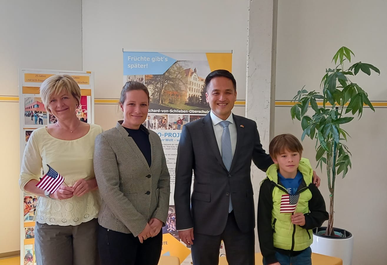 Am Mittwoch, den 04.05.2023 besuchte der US-Generalkonsul für Sachsen, Sachsen-Anhalt und Thüringen Ken Toko unsere Schule, um mit Schülerinnen und Schülern über aktuelle Themen zu sprechen.